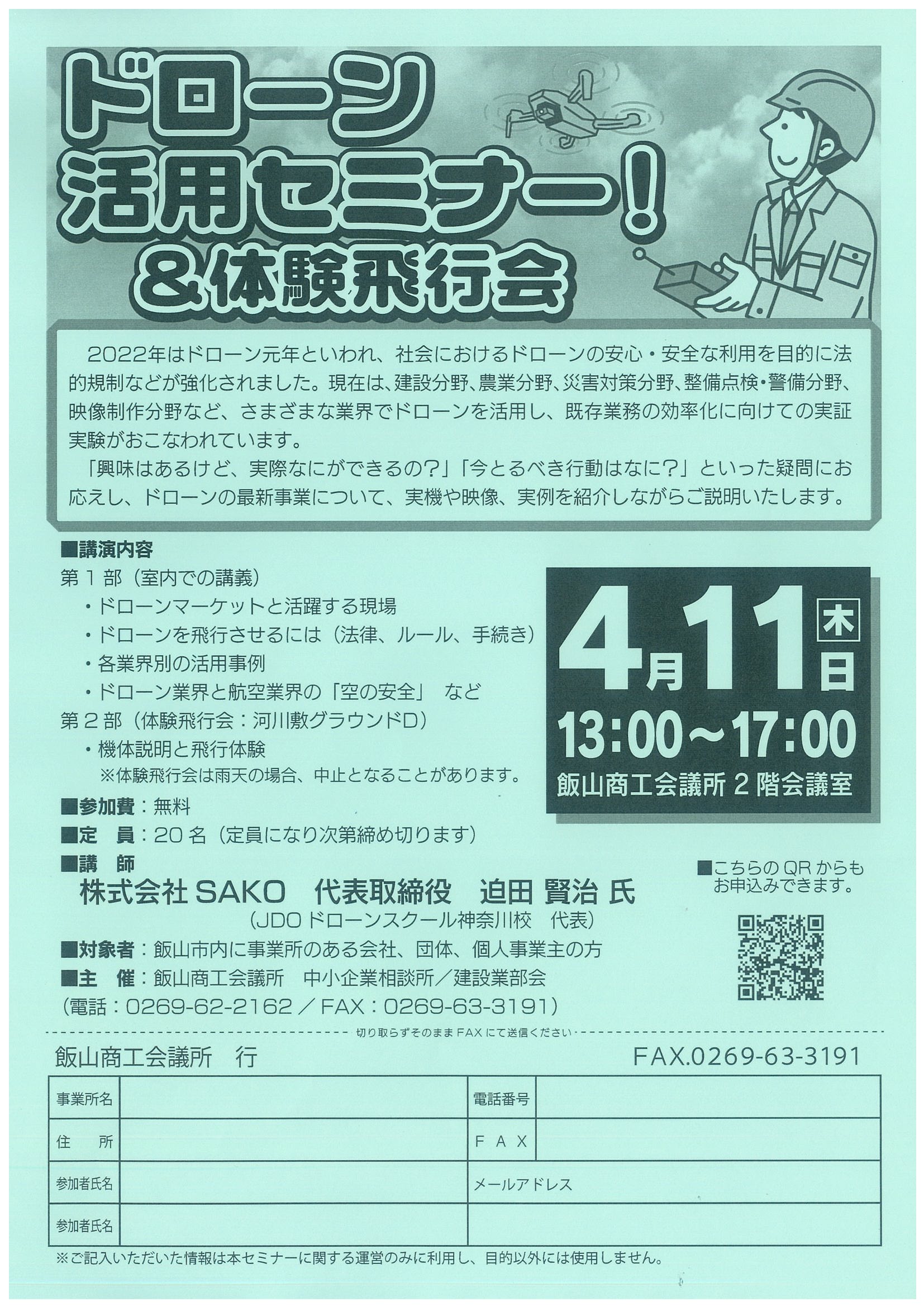 - 2024/03/21【講習会】ドローン活用セミナー&体験飛行会 4/11 開催!~ドローンの最新事業について実機や映像交えながらご紹介します~